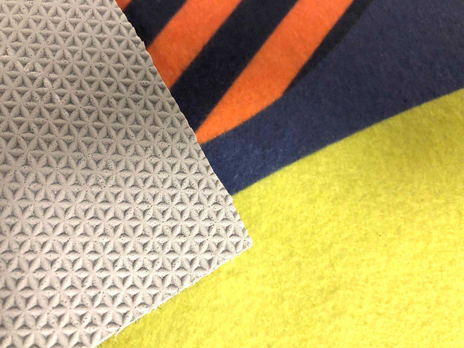 We use a unique fibrous non-woven material. The carpet material consists of a non-slip-rubberised backing liner. The top carpet layer, which is 700gsm and soft to the touch goes through our special printers. The print technique we use when printing custom carpet is Dye-Sublimation. Dye sublimation uses special dyes. The dye infuses with the individual fibres, colouring the fibres molecularly. Colours introduced on a molecular level means that the pigment won’t fade or run as the colour has now become part of the material. Maximum print width in x1 piece is 2.5m. Larger sections would need to have a join. Edge of the event carpet can be taped into position using standard double-sided tape.