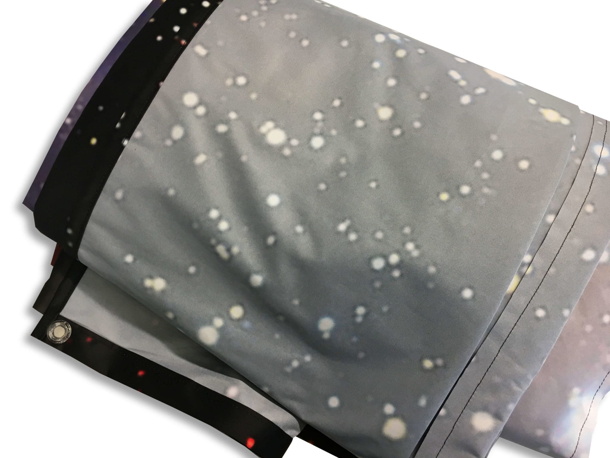 We produce large printed backdrops of any size. Our backdrop printing service allows us to print fabrics on rolls up to 3m wide to provide huge seamless panels. Larger banners will contain a slight seam. However, we have never had any reports of a stitched seam being a problem.