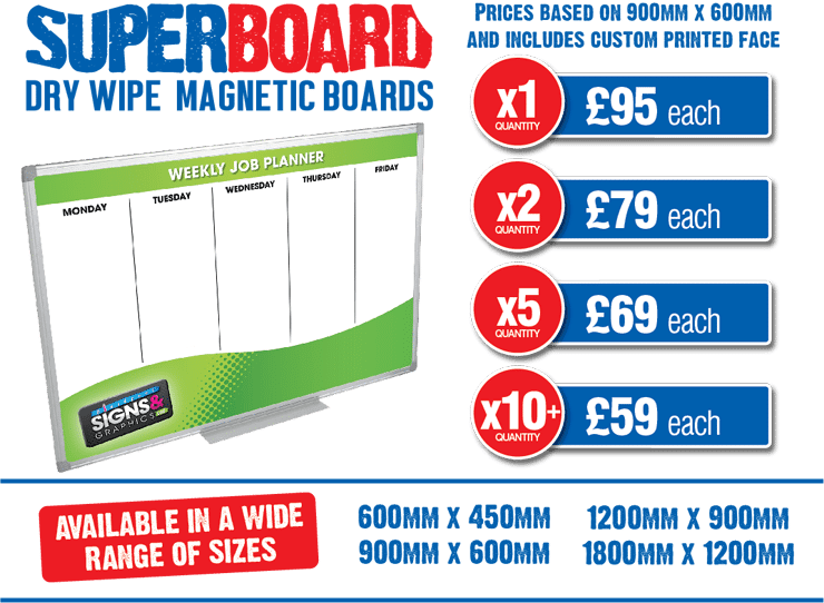 We produce thousands of custom printed whiteboards each year to the trade. These are used for planning, production, training, sales performance tracking, health and safety stats, staff information and much more.