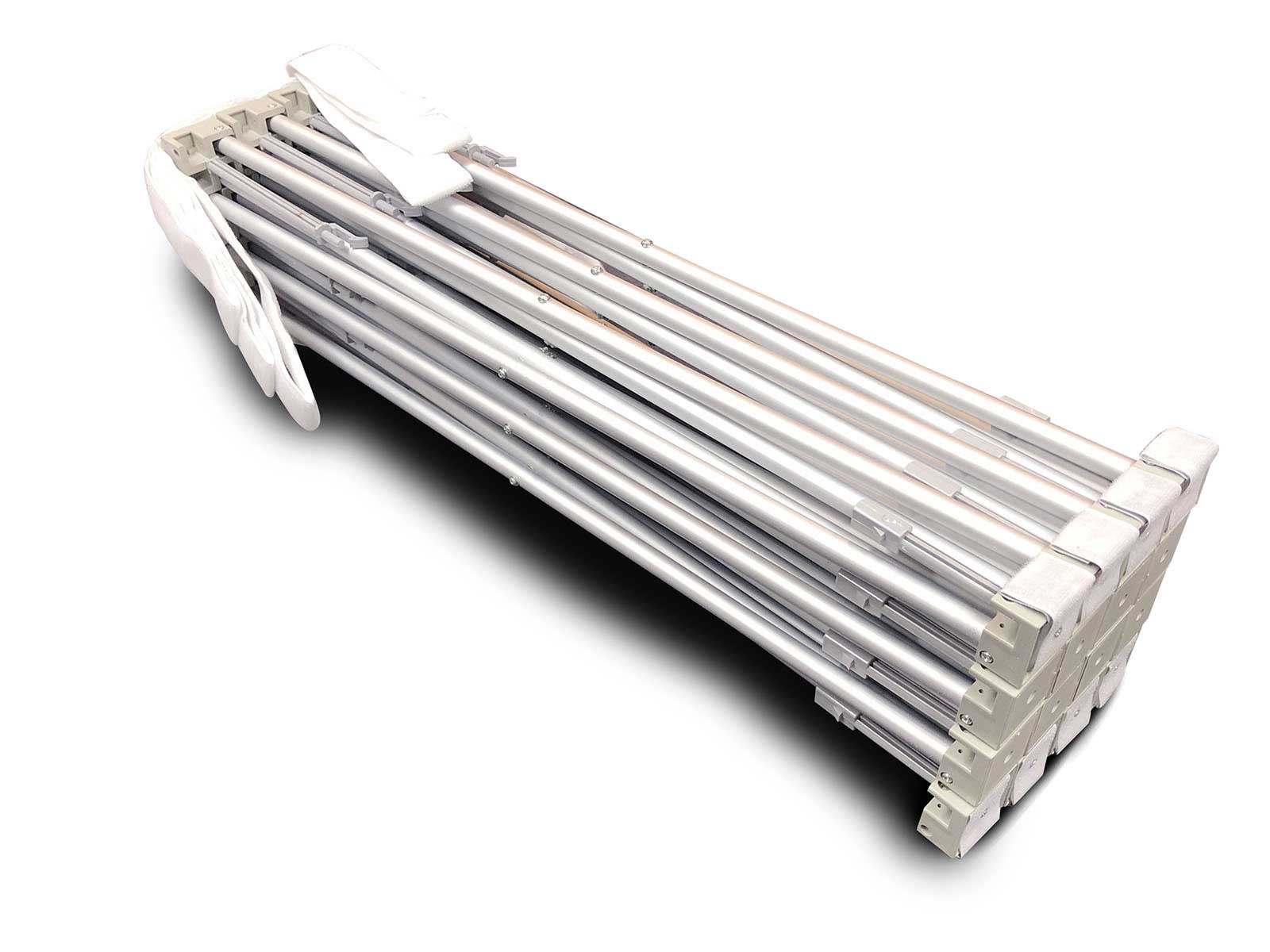 Two strong pop-up frames fit together to provide a substantial but lightweight structure. Your seamless fabric is then simply attached using velcro ties. The frame provides tension, smoothing out any creases in the fabric caused by transport or storage.