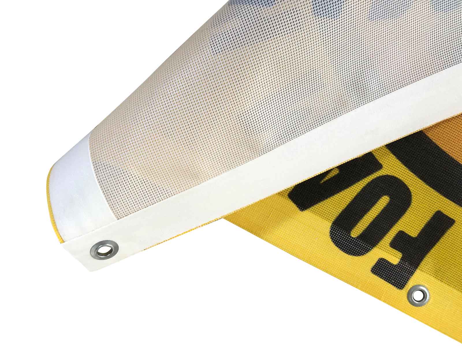 We make mesh banners with welded hems and a range of other finishing options. Our custom mesh banners are supplied with either hem and eyelets or pole pockets to the industry’s highest standards. We also offer a reinforced hem on larger banners. A reinforced hem adds an extra layer or reinforcement webbing which increase hem strength. Reinforcing a banner hem creates super strong mesh banners with extra longevity.